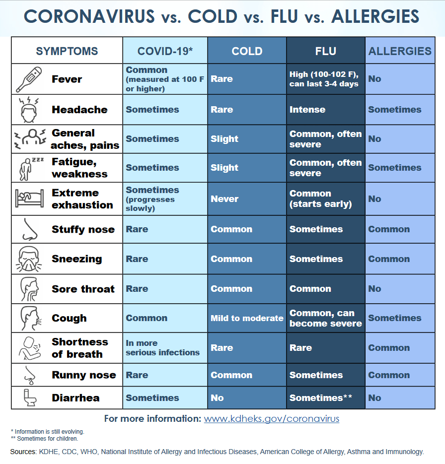 A Comparison Chart of Symptoms of Flu, Cold, Allergies and Coronavirus